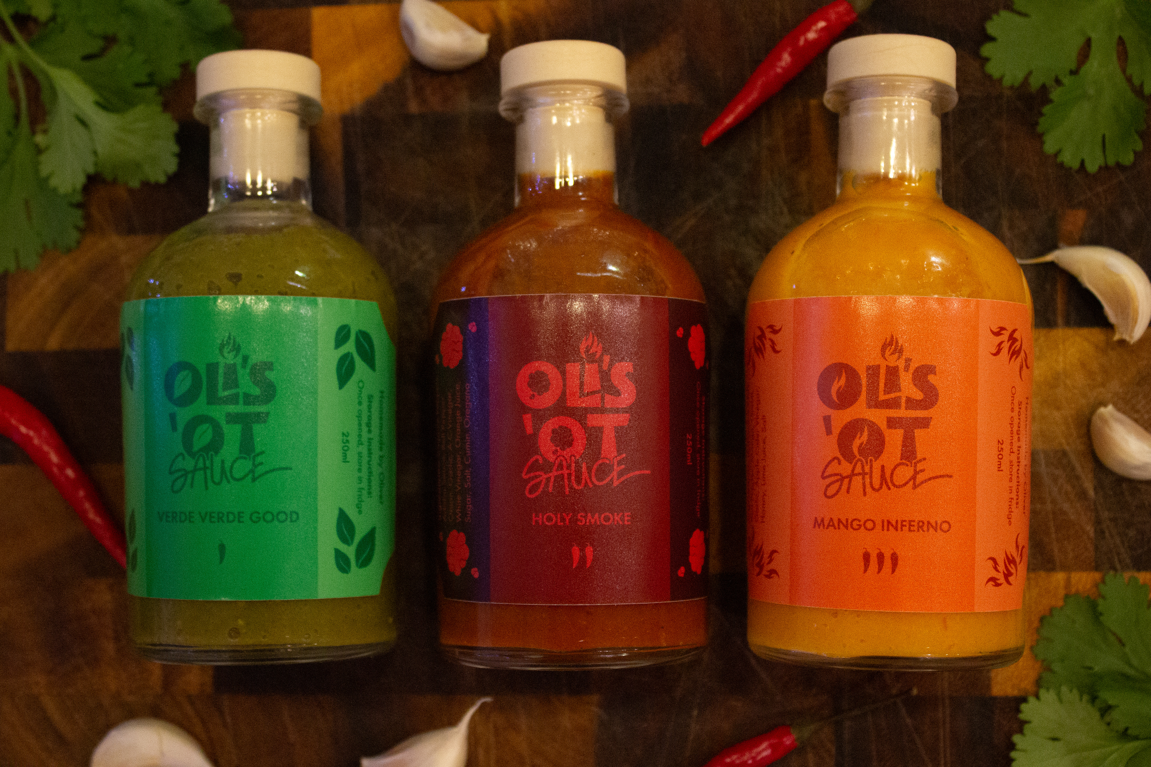 Designed a modular label system anchored by a shared logo (slight logo change for each one) and typography, with colour variations tied directly to each sauce. The result balances consistency with clear visual distinction across the trio.